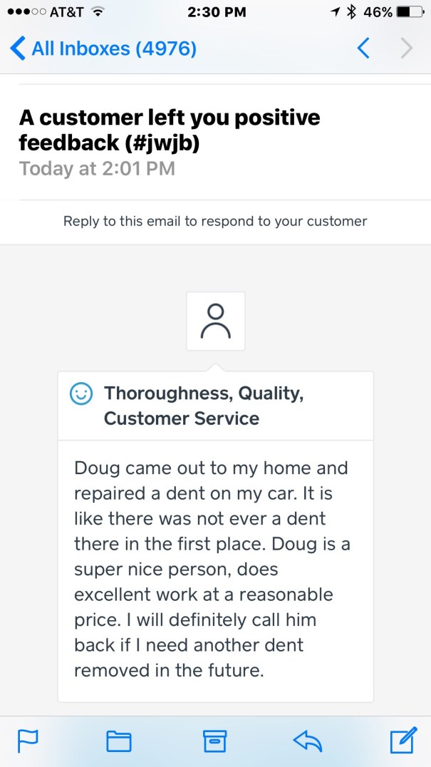 Thank you so much Doug for fixing my car ! You showed up on time, so professional, the dent is gone and you came to my place off work to repair the dent. WOW !! What a pleasure doing business with you .